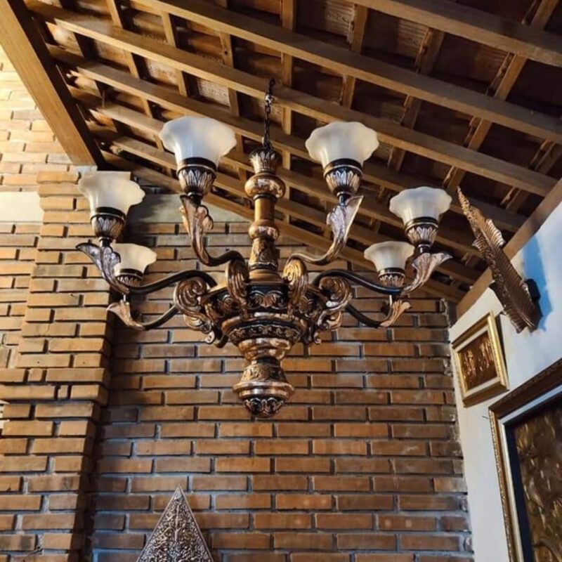 • 🏠 Dekorasi Interior: Panel dinding ukir, plafon tembaga, dan hiasan dinding